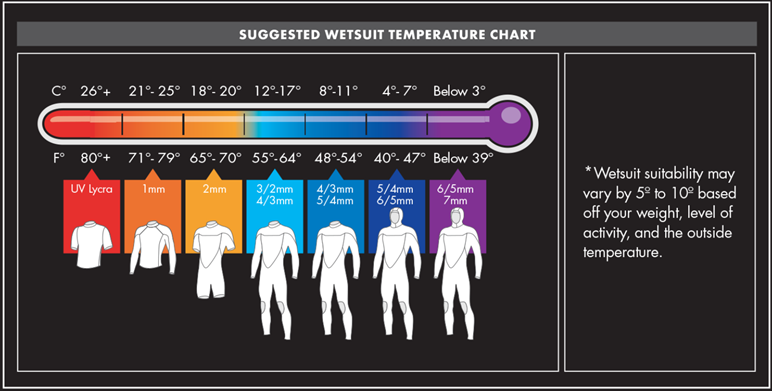 What thickness of wetsuit should I buy?Updated 2 months agoAlthough there are many other variants to consider, including construction and closure type, the chart below is a good starting guide when choosing your wetsuit thickness. Was this article helpful? YesNo
